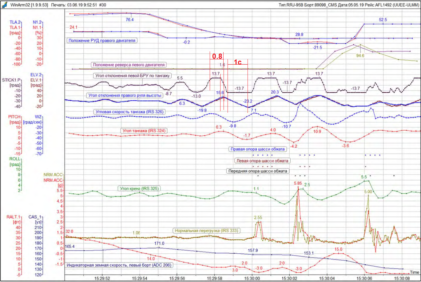 В предварительном отчёте МАК на стр. 86 действительно есть графики положения БРУ (6-й график сверху), руля высоты (РВ) (5-й) и угла тангажа (4-й сверху). Но никакой задержки передачи управляющего воздействия я там не увидел. Максимум 0,1...0,2 сек между началом перекладки БРУ и началом перекладки РВ, что в 10 раз меньше времени перекладки РВ. И то не уверен - слишком крупный масштаб: 1 клеточка=1 сек. А самолёт, судя по графикам тангажа, очень послушно себя вёл, точно отслеживал угол тангажа по положению РВ - графики положения РВ и угла тангажа практически синхронны. Другое дело, что отклонение РВ происходит с некоторой конечной скоростью, и это нормально - требованиями лётной годности оно регламентируется в том числе и ограничением максимальной скорости перекладки. Зато "сайд-стиком" пилот работал как тумблёром - из одного крайнего положения резко переводил в другое крайнее. График из синусоиды превращается почти в меандр. РВ на это ожидаемо реагировал "треугольниками" на графике - сначала максимально быстро в одно положение, потом с такой же скоростью в противоположное, все штатно. Так же нет никакого запаздывания в момент удара (см.самый верхний график - перегрузка n=5.85) Пилот реагировал верно (вроде как), просто допустил перерегулировку - раскачал самолёт.