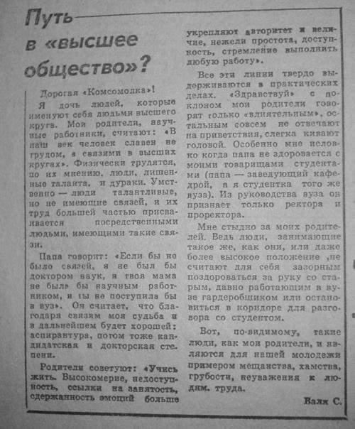 Продолжаем исследовать советскую жизнь. Раскопки, раскопки и ещё раз - раскопки. На этот раз порадовал старый френд skif_tag, разместив статью, а точнее - некое письмо от девочки-мажора. Напомню, что мажорами в позднем СССР называли детей обеспеченных родителей, но не всех, а пресыщенно-модных, тусовочных, западно-ориентированных. Таким образом, сын больших людей, не имеющий при этом доступа ко всяким лейбловым шмоткам, аудиосистемам и теннисным кортам в закрытых или полузакрытых спортклубах, мажором не считался. Какой же это мажор, если у него нет последнего альбома 'Video Kids' (это для примера, а не для дискуссий) каких-нибудь? Я знавала скромно одетых и где-то даже обделённых детей очень состоятельных отцов. Сама я очень рано пошла работать, несмотря на то, что мама работала в министерстве и могла меня пристроить. Но, увы. Вечернее отделение и ночные смены на телефонной станции... Не знаю, хорошо это или плохо. Окружающие чаще всего крутили пальцем у виска. В общем, читаем.