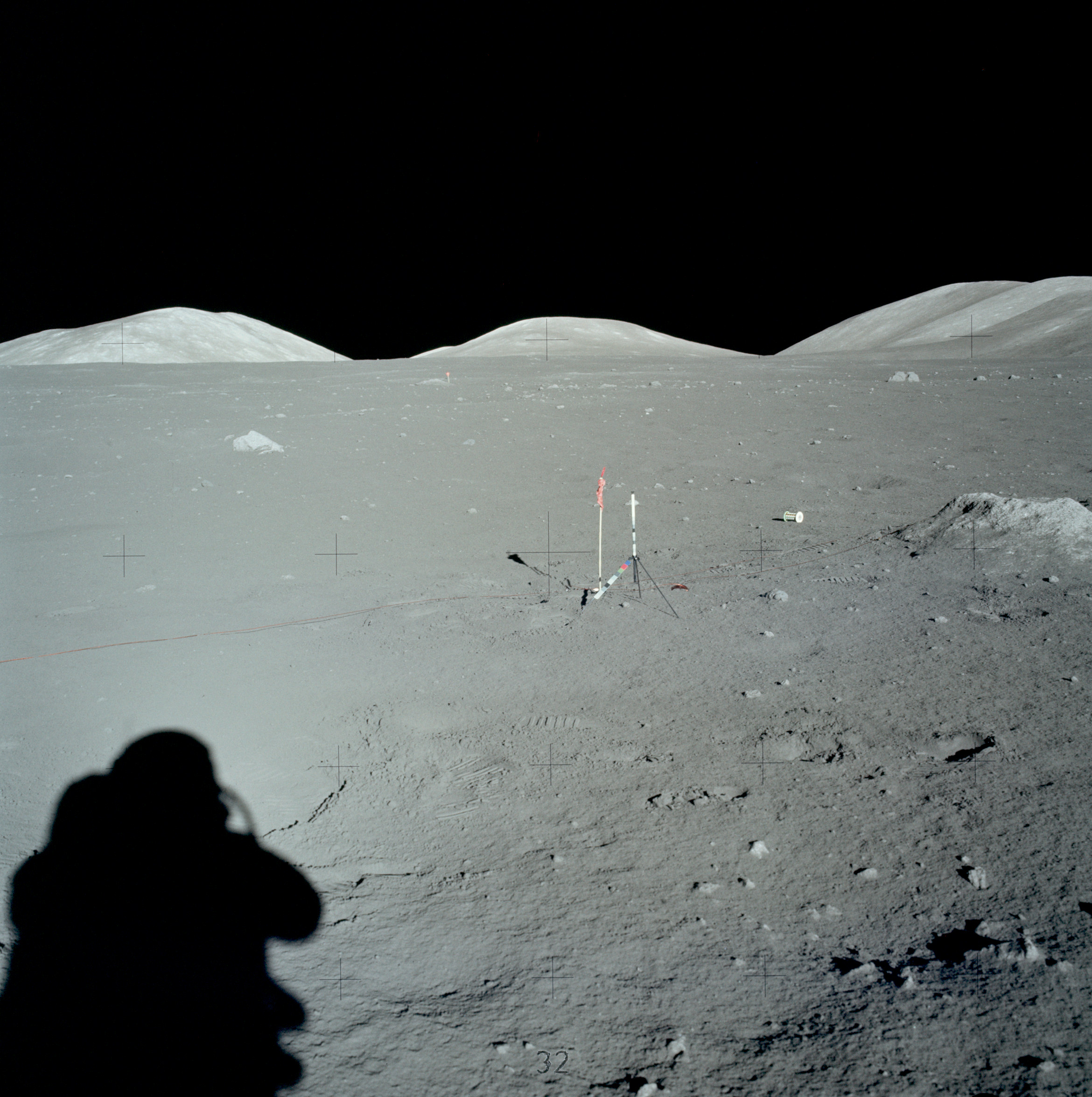 Банальная перспектива. Достаточно присмотреться к теням от камней, чтобы увидеть, что направление теней меняется по мере приближения к тени от космонавта. Вот пример:
