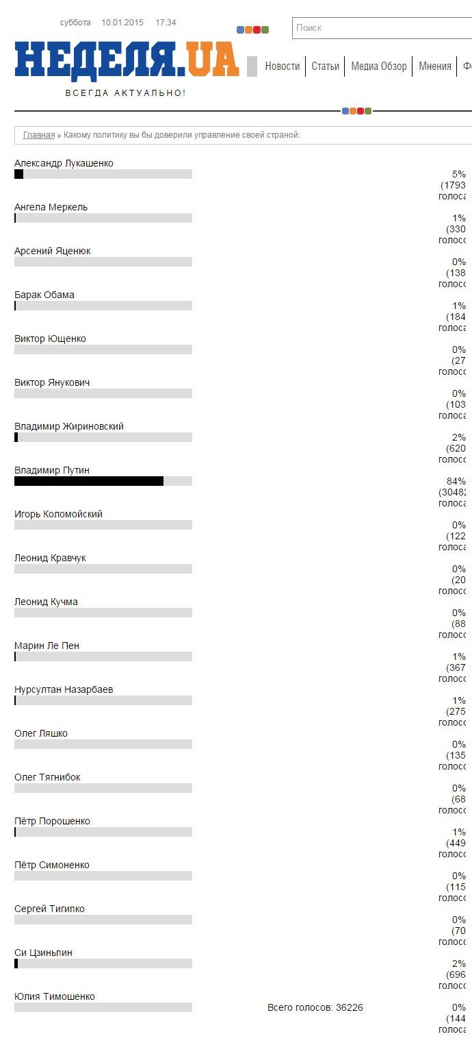 Результаты голосования прокомментировал изданию "Украина.ру" главный редактор «Неделя.ua» Гурген Григорян: «Да, действительно, был такой опрос и большинство проголосовало за Путина. Возможно, это связано с тем, что в славянских народах все еще есть вера в доброго и справедливого правителя. Кроме того, на Украине нет яркого харизматического лидера, в которого можно поверить».