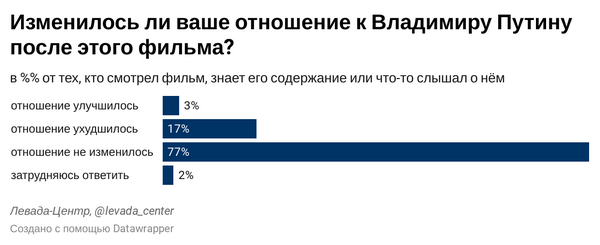 77% россиян, видевших фильм или что-то слышавших о нем, не изменили своего отношения к президенту, еще 3% - улучшили его