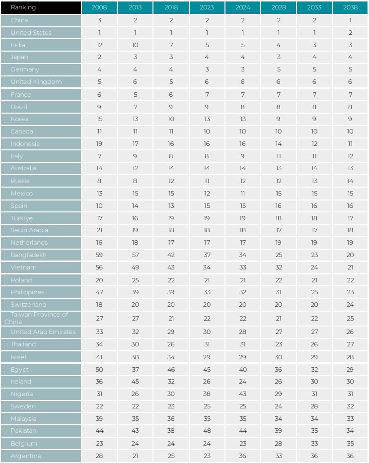 Лондонская компания CEBR («Центр экономических и бизнес-исследований») выдала экономический прогноз. Это номинальный ВВП по странам, выстроены по прогнозу на 2038 год: