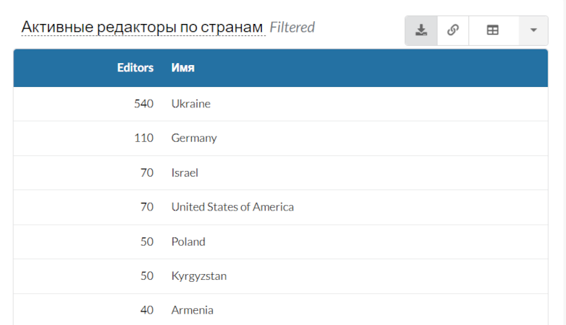Выбрал режим «Таблица» и получил список всех стран, которые участвовали в статистике. России там нет. Впрочем, это было понятно ещё до того — хотя бы потому, что Антарктида там того же цвета, что и Россия. Как-то не верится, что пингвины так же активно редактируют русскую Википедию, как граждане России.